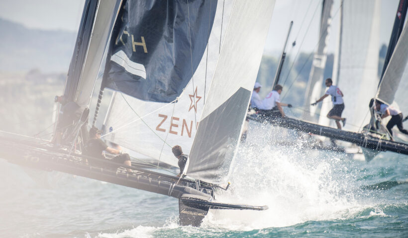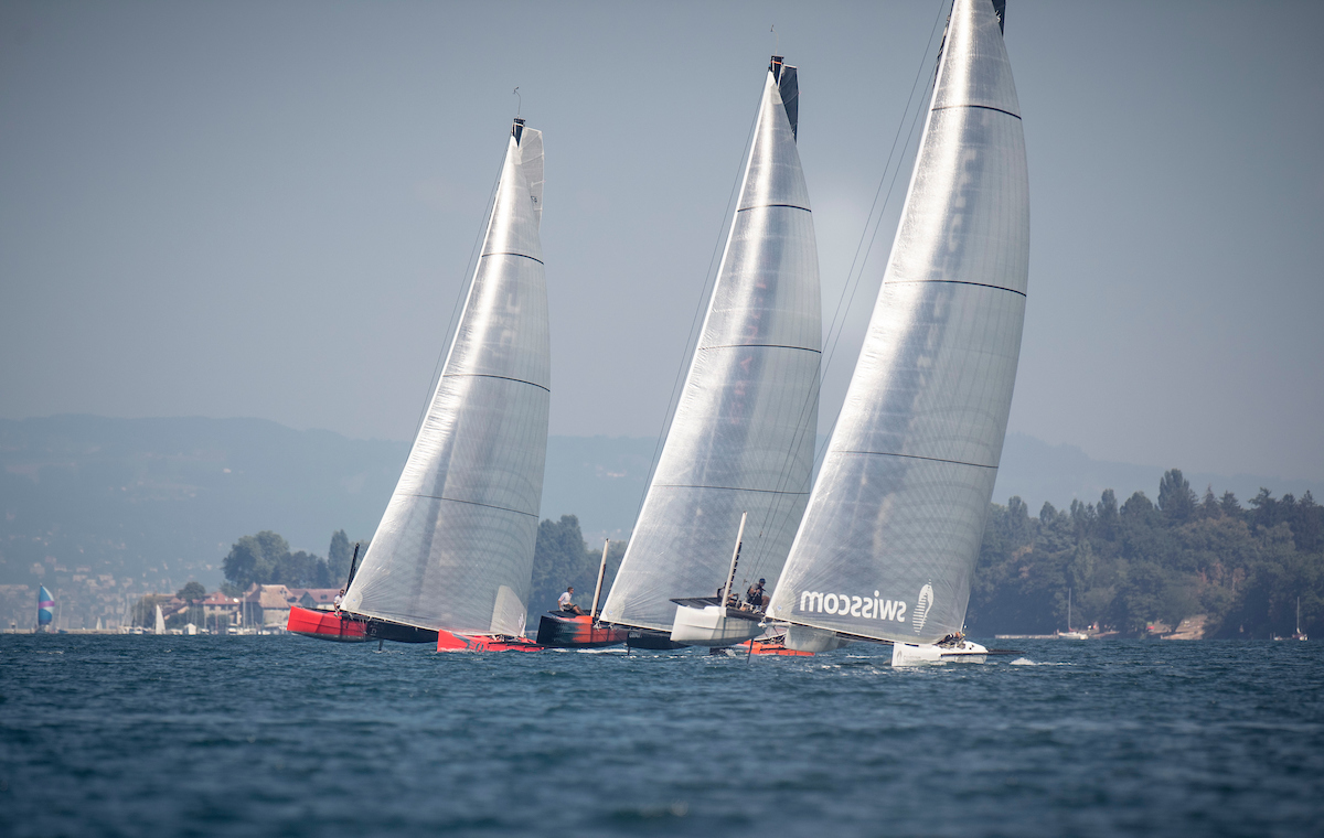 Catamaran D35 Alinghi en pleine course sur le lac Léman pendant le Grand Prix de Crans